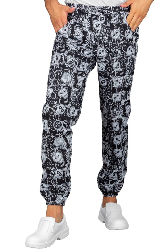 Pantagiaffa unisex con elastico alle caviglie skull 12. Molto utilizzato anche nel settore medicale, estetico, sanitario, ospedaliero e alimentare. come divisa da lavoro medico , infermiere, per aziende di servizi, pulizie e cucina e cuoco. Cotone. Peso: 190 Gr/m². Composizione: 100% Cotone. Pantagiaffa
