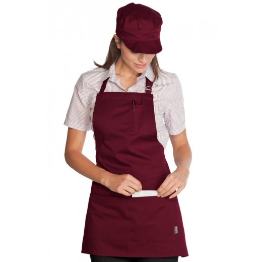 Grembiule Pettorina donna Piccadilly con tasca centrale bordeaux. Ottimo Per settore alberghiero e parannanza per ristorazione. Divisa da lavoro per bar, pub, ristoranti, alimentari, cucine, enoteche e catering. Poliestere Cotone. Peso: 195 Gr/m². Composizione: 65% Poliestere 35% Cotone