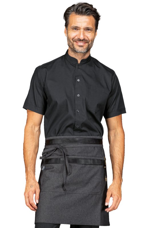 Grembiule unisex Leonida Isacco Black Jeans con inserti in pelle nero e tasca centrale. Con lacci in tessuto. Ideale per settore alberghiero e parannanza per ristorazione e cuoco. Divisa da lavoro per bar, pub, ristoranti, alimentari, cucine e catering. Cotone. Peso: 220 Gr/m². Composizione: 100% Cotone. Con pelle Nero